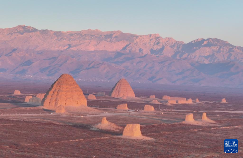 寒冬时节,晨曦中的西夏陵与缤纷霞光及峰峦叠嶂的贺兰山共同形成雄伟壮丽的景观。