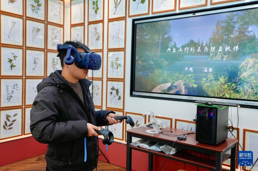 1月26日,游客在宁夏固原市隆德县中医药科普体验馆内体验VR采药。