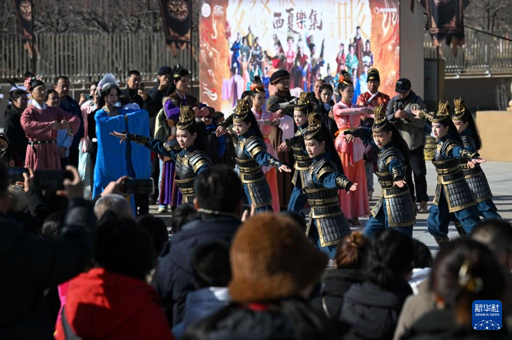 2月13日,扮演西夏公主的演员(中)在银川市西夏陵景区表演。