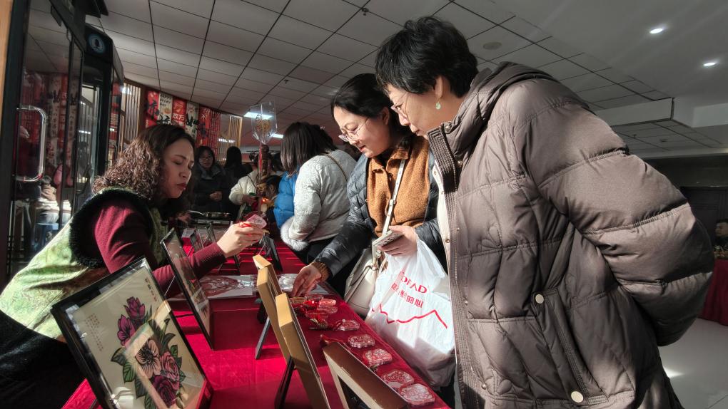 “年味市集”非遗展区,贺兰砚、刺绣、皮影、扎染、葫芦烙刻画等宁夏本土非遗项目集中亮相,精巧的文创产品引得市民驻足询价。“这么多传承人聚在一起展示技艺,氛围特别好。”宁夏黄河石画传承人宋笑珍说,希望传统技艺薪火相传。